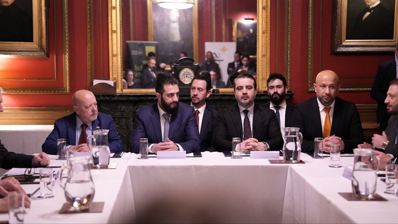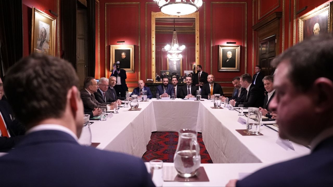 اجتمع فخامة رئيس الجمهورية العربية السورية السيد أحمد الشرع برفقة وزير الخارجية والمغتربين السيد أسعد حسن الشيباني والوفد الوزاري المرافق في العاصمة لندن مع ممثلين عن كبرى الشركات البريطانية ورجال الأعمال البريطانيين والسوريين، حيث جرى بحث سبل تعزيز التعاون الاقتصادي والتجاري بين البلدين، واستعراض فرص الاستثمار المتاحة في مختلف القطاعات.