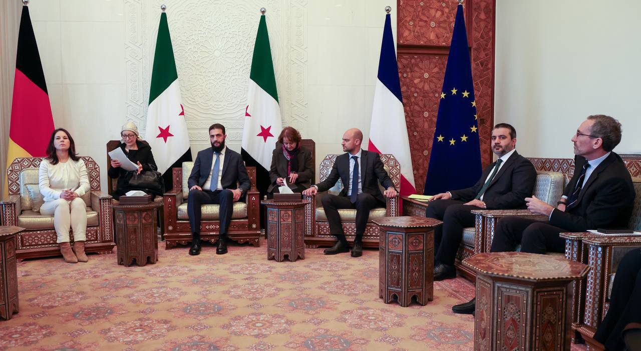 ومعالي وزير الخارجية السيد أسعد الشيباني لوزيري الخارجية الفرنسية والألمانية السيد جان نويل بارو والسيدة أنالينا بيربوك والقائم بالأعمال لبعثة الاتحاد الأوروبي مايكل أونماخت في دمشق