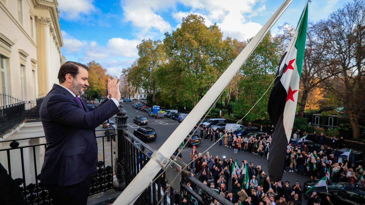 Foreign Minister and Expatriates Minister Asaad Hassan al-Shaibani raises the flag of the Syrian Arab Republic above the Syrian Embassy building in the British capital, London, signaling the resumption of its official work after a 14-year closure.