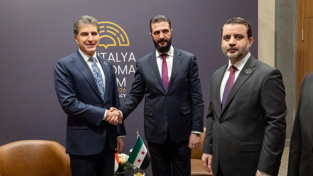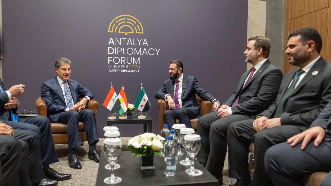 اجتمع فخامة رئيس الجمهورية العربية السورية السيد أحمد الشرع ووزير الخارجية والمغتربين السيد أسعد حسن الشيباني ورئيس جهاز الاستخبارات السيد حسين السلامة، مع رئيس إقليم كردستان العراق السيد نيجيرفان بارزاني والوفد المرافق له، على هامش منتدى أنطاليا الدبلوماسي في تركيا.