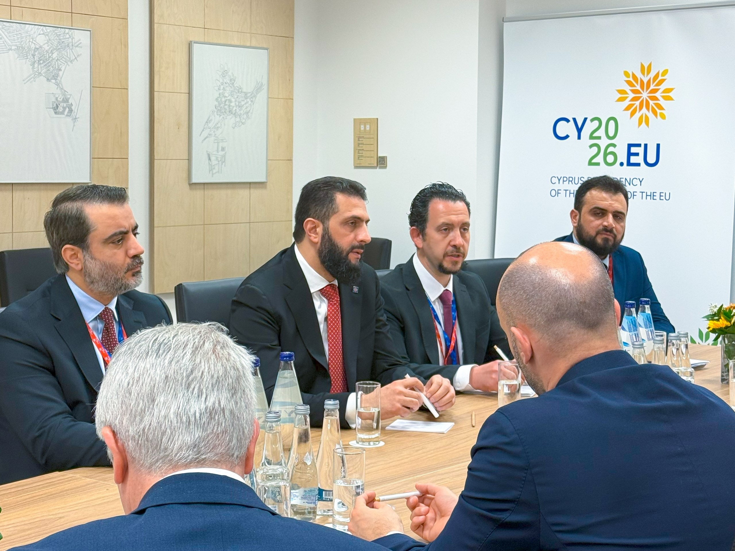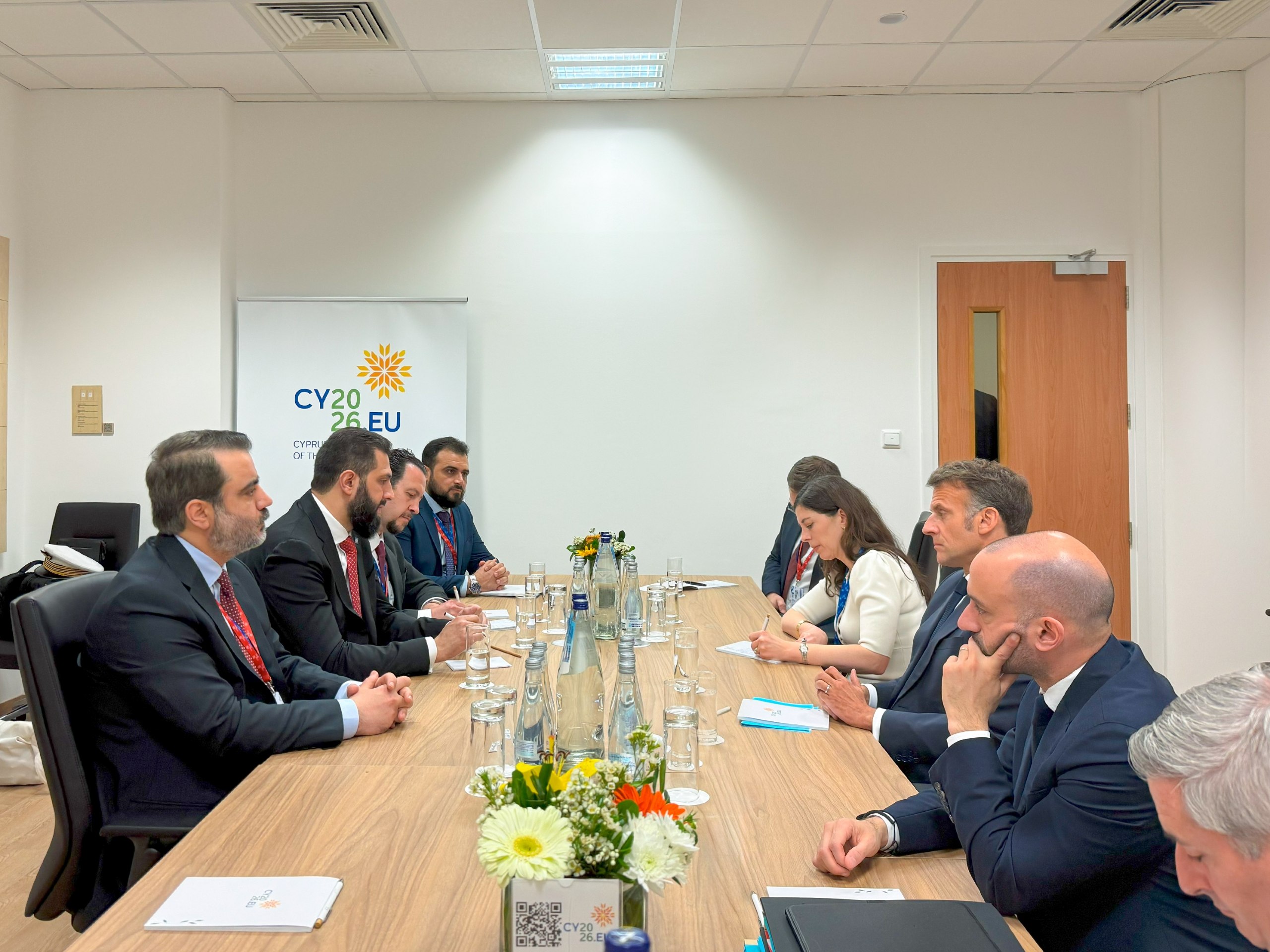التقى السيد الرئيس أحمد الشرع رئيس الجمهورية الفرنسية إيمانويل ماكرون، بحضور وزير الخارجية والمغتربين أسعد الشيباني، وذلك على هامش الاجتماع غير الرسمي للاتحاد الأوروبي والشركاء الإقليميين في العاصمة القبرصية نيقوسيا.
