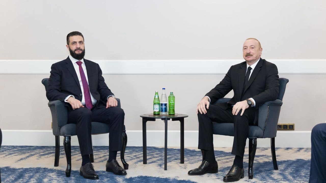 فخامة رئيس الجمهورية العربية السورية السيد أحمد الشرع ووزير الخارجية والمغتربين السيد أسعد حسن الشيباني ورئيس جهاز الاستخبارات السيد حسين السلامة، يلتقون رئيس جمهورية أذربيجان السيد إلهام علييف